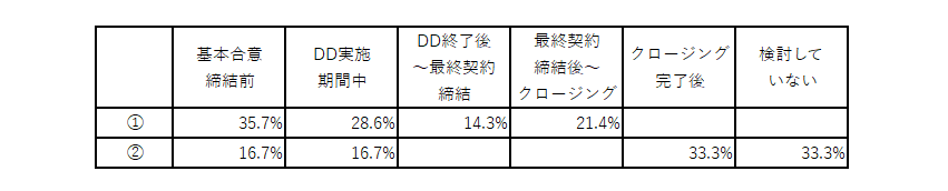 また、同ガイドラインでPMIの検討開始時期についての調査結果※1では、「期待を上回る成果が得られている」と回答した企業(①)と、「かなり期待を下回る成果しか得られていない」と回答した企業(②)では、以下のような差がありました。